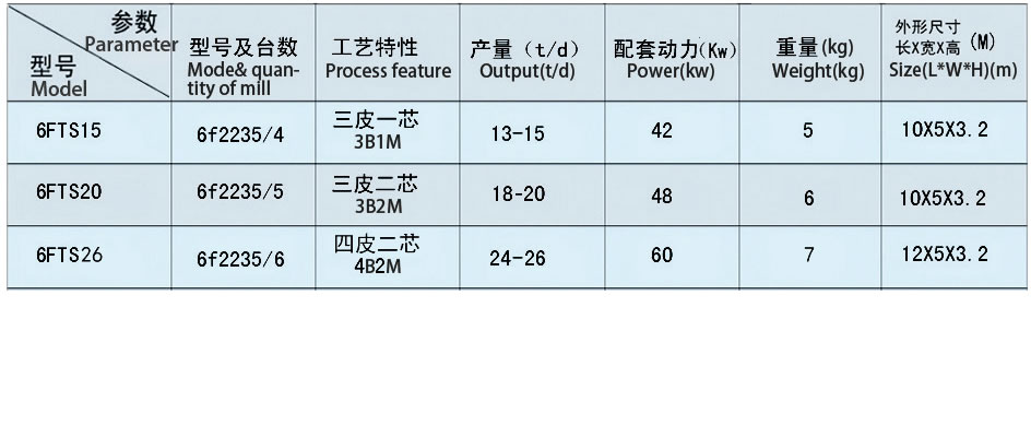 本设备设计科学工艺先进,清理采用三筛两打两去石一洗麦一磁选,粉间采用三皮两芯工艺。可生产特一粉、特二粉、